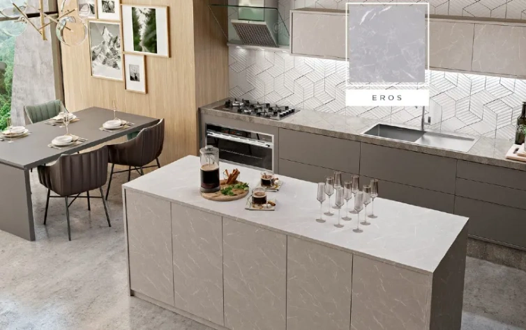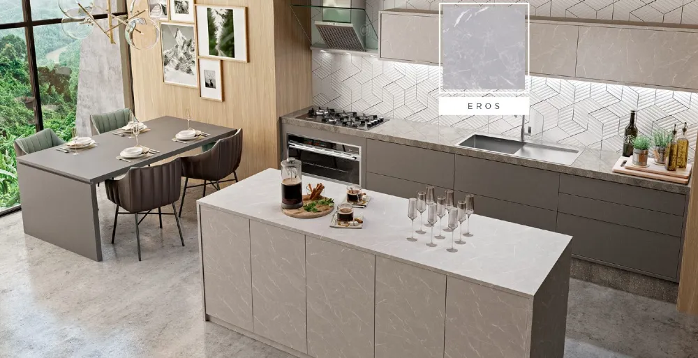 Inspirado no mármore – que é uma tendência global -, o padrão possui veios claros e estrias distribuídas, que conferem sensação de movimento na superfície dos móveis. Seu nome é referente ao asteroide Eros, que passou bem perto da Terra, em 2012.